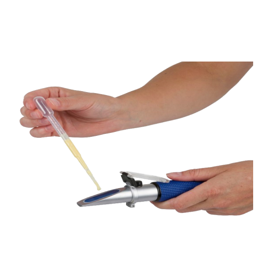 | Процес визначення якості молозива | Видоїти молозиво в ємність (це може бути пересувний доїльний апарат), набрати трішки в піпетку, потім нанести на скельце рефрактометра, закрити кришку та поглянути у лінзу апарата. Схема додана на картинці |